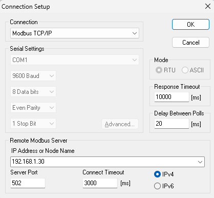 In the connection options, select "Serial Port" to indicate that serial communication is currently used. If Modbus/TCP is used, select "TCP/IP".