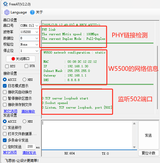 (1) Phenomenon after program burning: First, a PHY link test is performed to confirm the physical layer connection status is normal, ensuring the basic conditions for network communication; after the test passes, the system prints out the configured network address information to confirm whether the network configuration is correct; finally, it listens on port 502 for client connections.