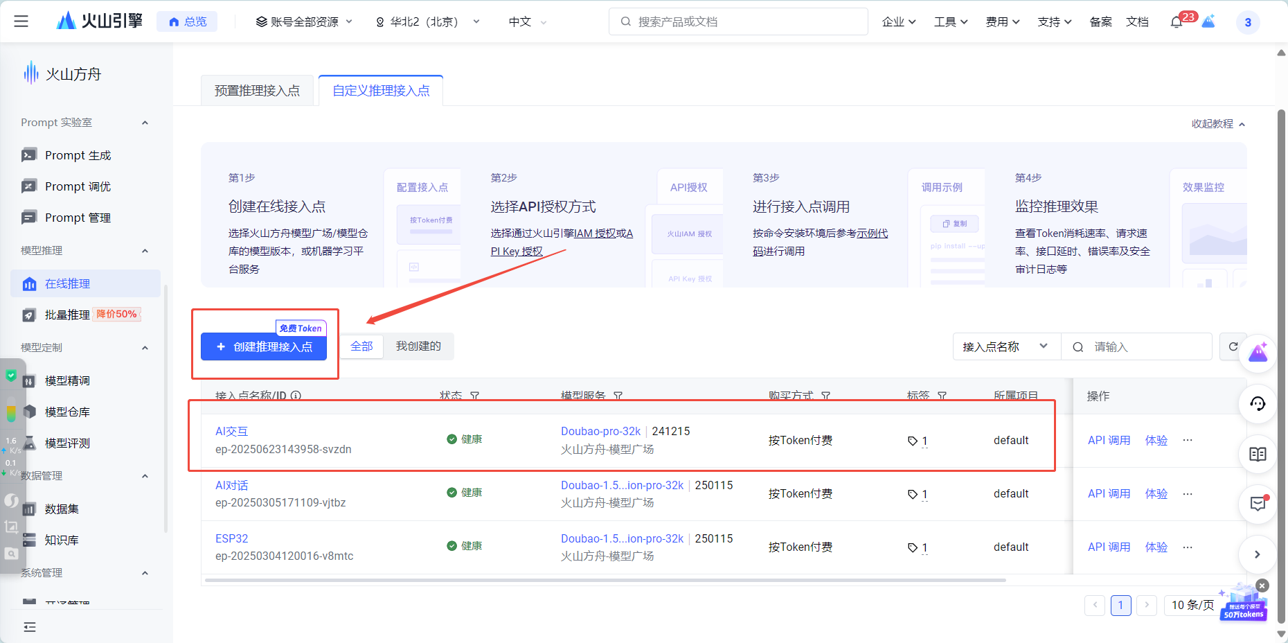 Taking Doubao-pro-32k as an example: Go to Create Inference Access Point and click 【Create Inference Access Point】.