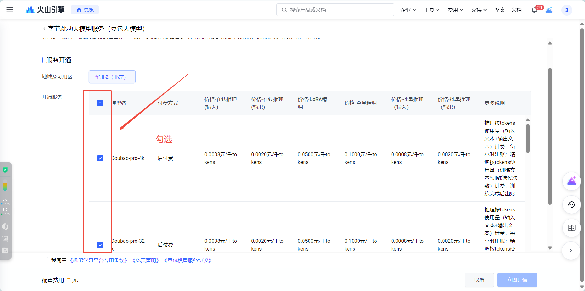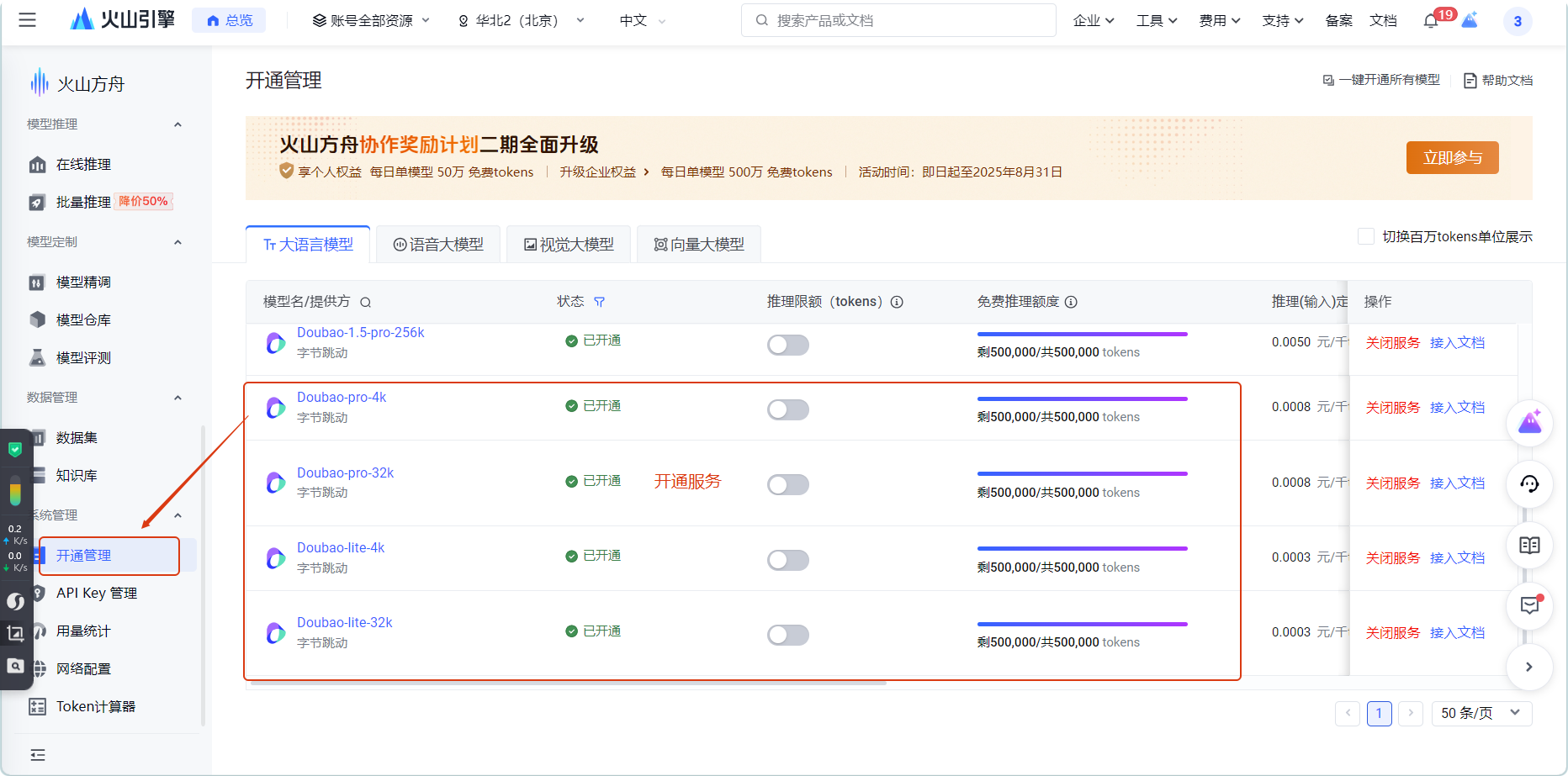 (Doubao-pro-4k, Doubao-pro-8k, Doubao-pro-32k, Doubao-lite-4k, Doubao-lite-8k, Doubao-lite-32k), then click [Activate Now].