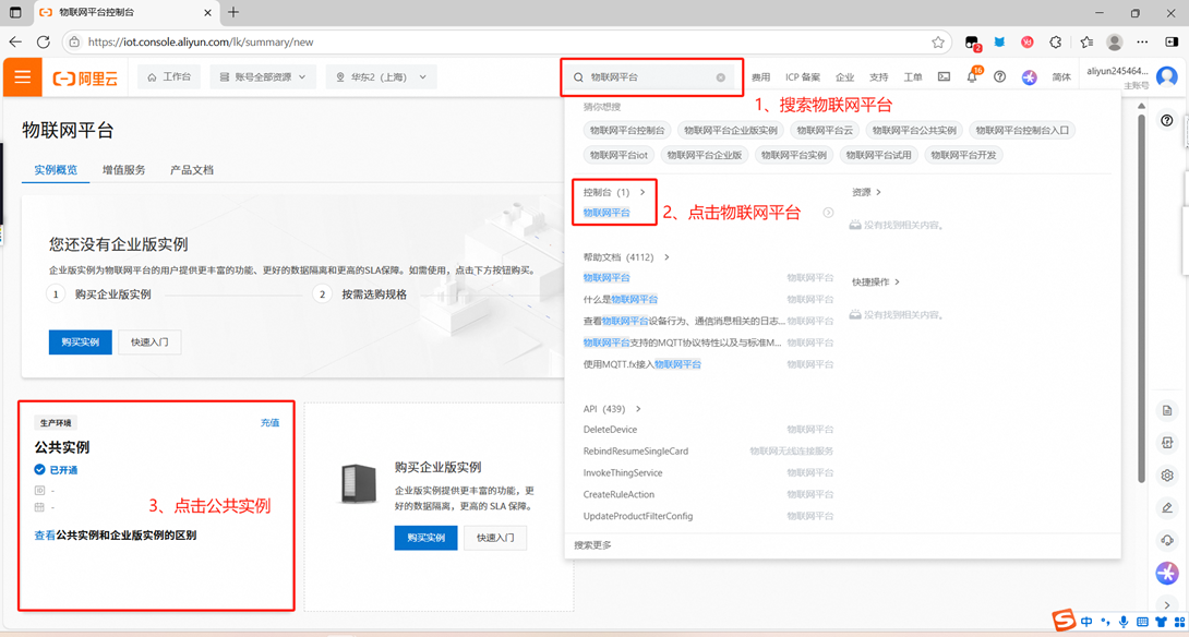 Search for IoT Platform -> Click IoT Platform -> Click Public Instances