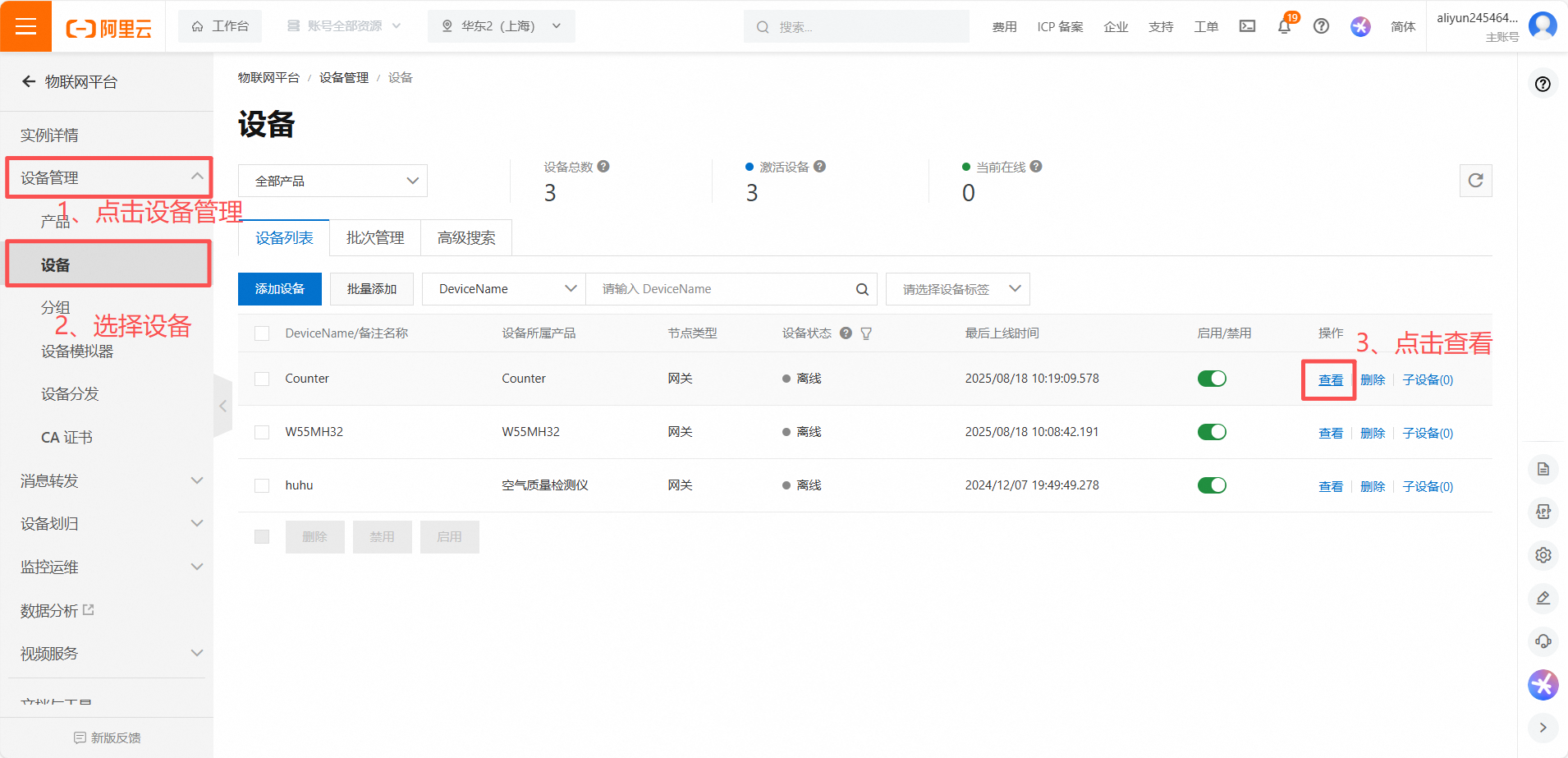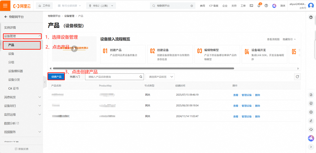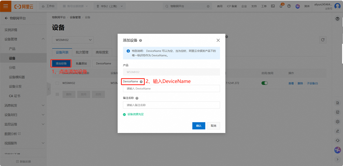 After successfully creating the product, click Add Device -> Enter DeviceName