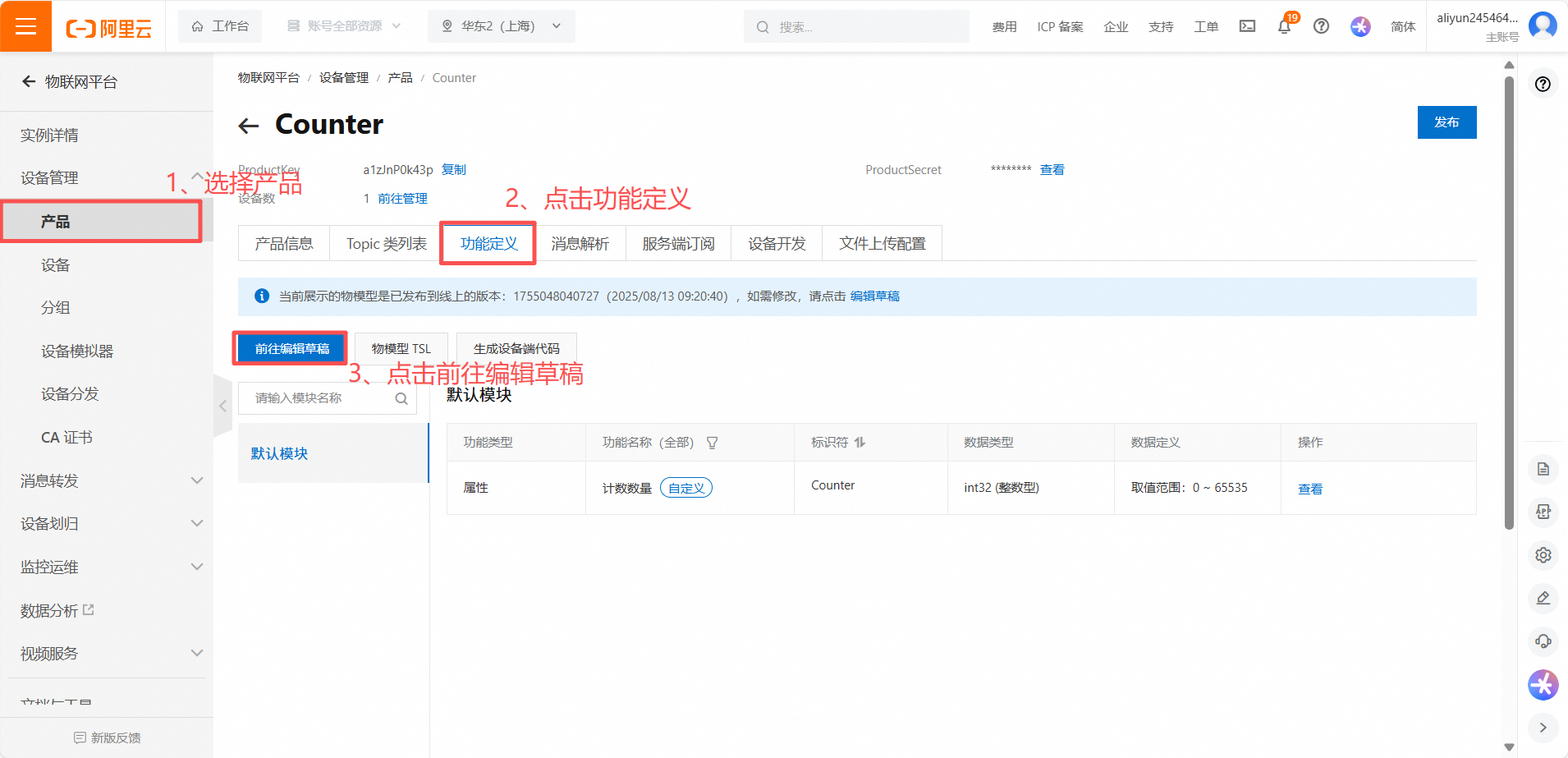 Define the IoT model: Select the product -> Click Function Definition -> Click Go to Edit Draft