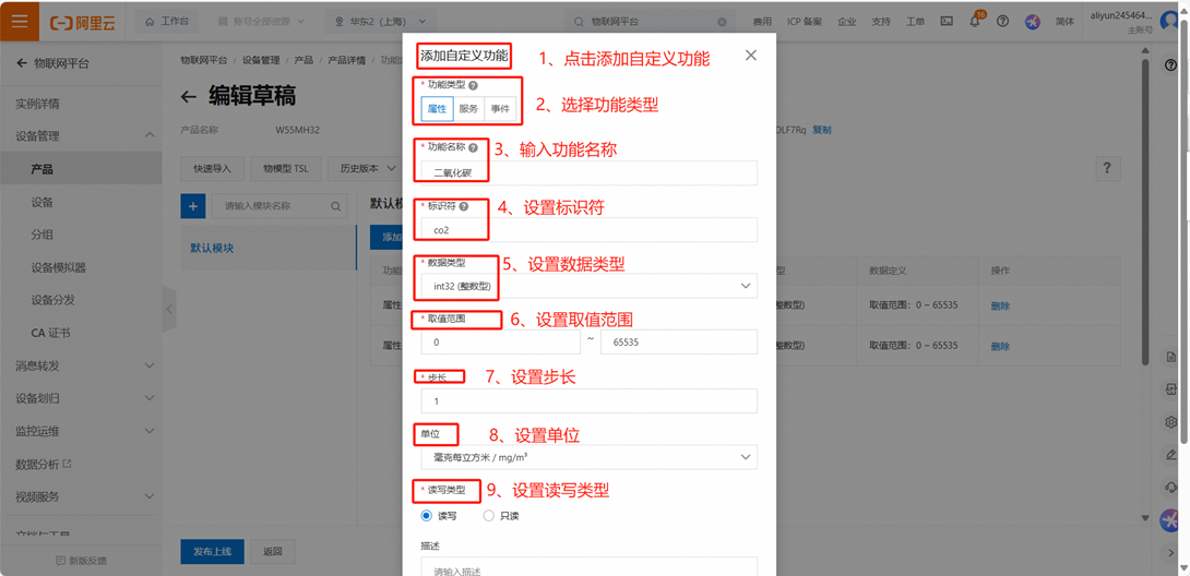 Click Add Custom Function -> Select Function Type -> Enter Function Name -> Set Identifier -> Set Data Type -> Set Value Range -> Set Step Size -> Set Unit -> Set Read/Write Type