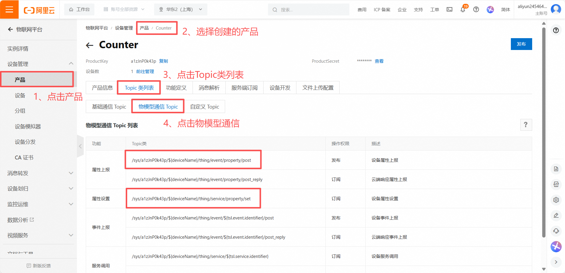 .pubtopic = "/sys/a1zJnP0k43p/Counter/thing/event/property/post", /*Define the publication message*/