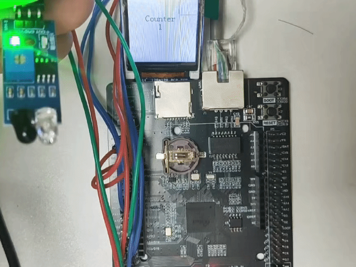After successful power-on initialization, the counter will increment by 1 when an obstacle is detected, and the result will be simultaneously displayed on the LCD screen. Data is uploaded to the Alibaba Cloud server every 5 seconds.