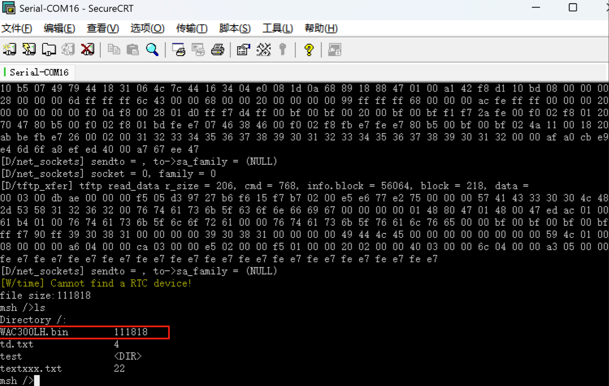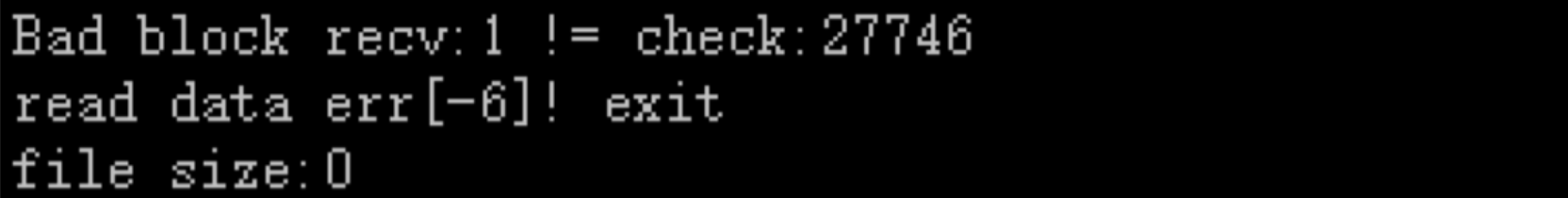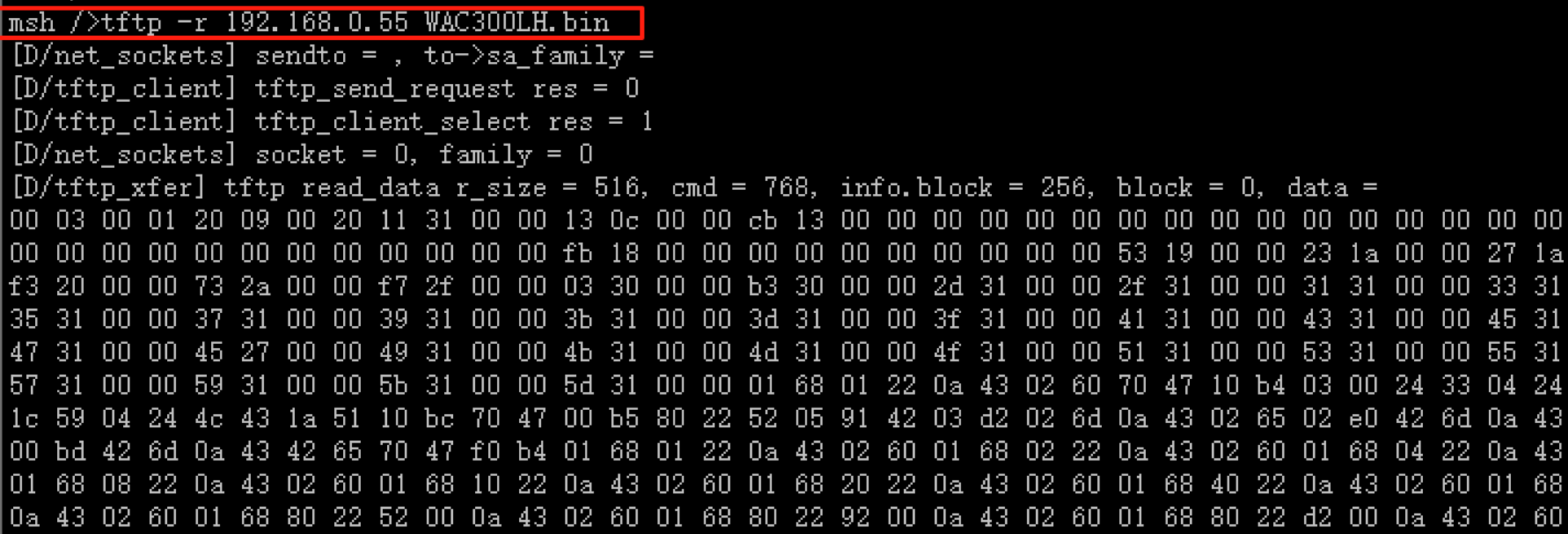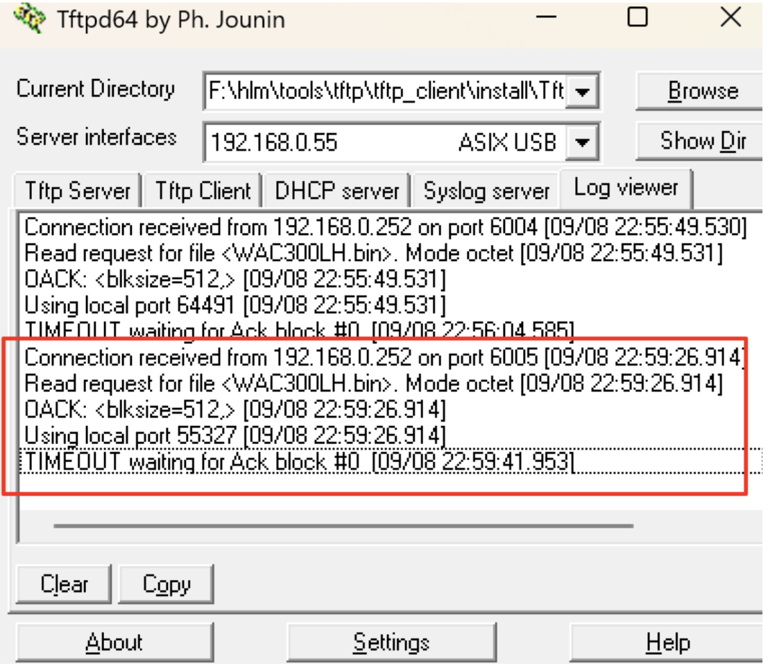 3) I'm using tftpd64 as the server on my computer. The device is using `tftp -r 192.168.0.55 WAC300LH.bin` to retrieve a file from my computer's tftpd64 server. When I try to get the file, the following error message appears. The error code is mismatched block sequence numbers, and I've been trying to fix it for a long time without success. After the error, the received file size is 0, indicating the file has been automatically created on the device's file system. Furthermore, when I run `tftp -r`, the tftpd64 server indicates the transfer has started, but it times out after a short while.