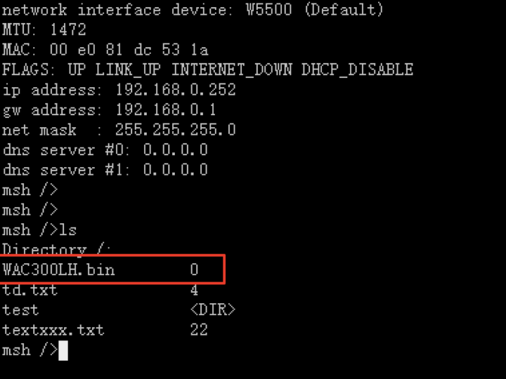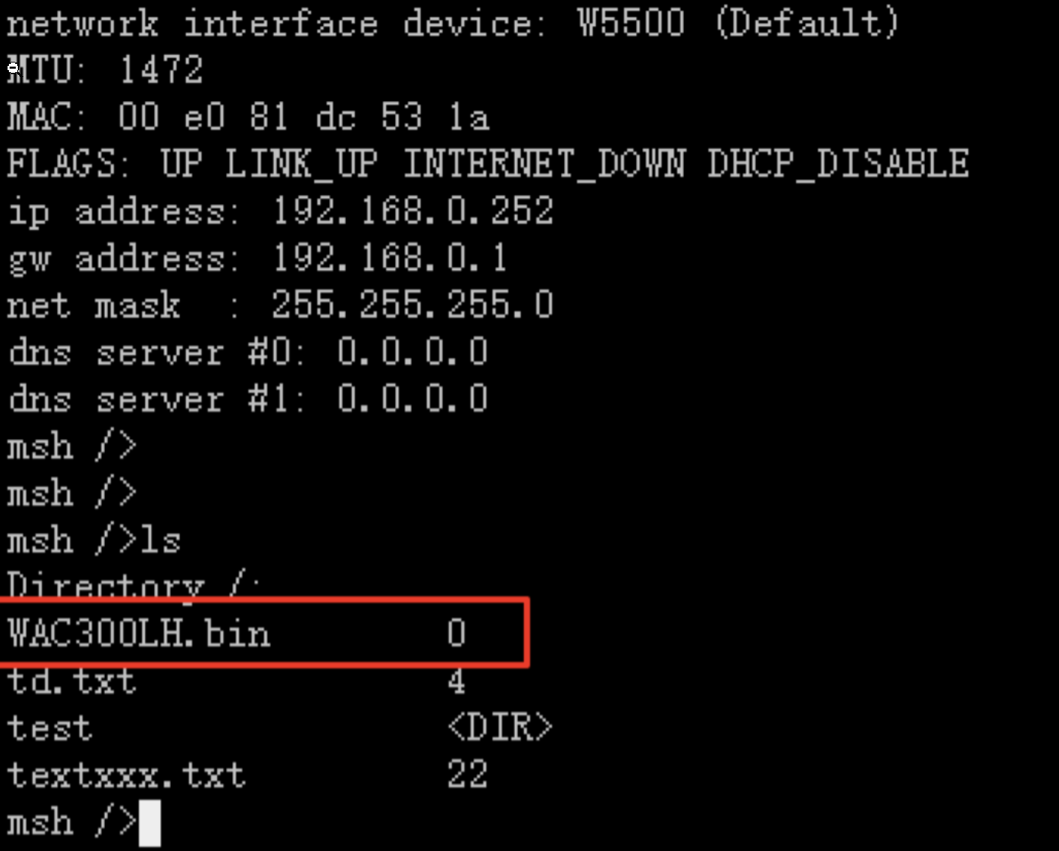 1) Using rt-thread version 5.1.0, a W5500 network module, the WIZNET software package, a w25q128 SPI flash, a littlefs file system, and the tftp software package.