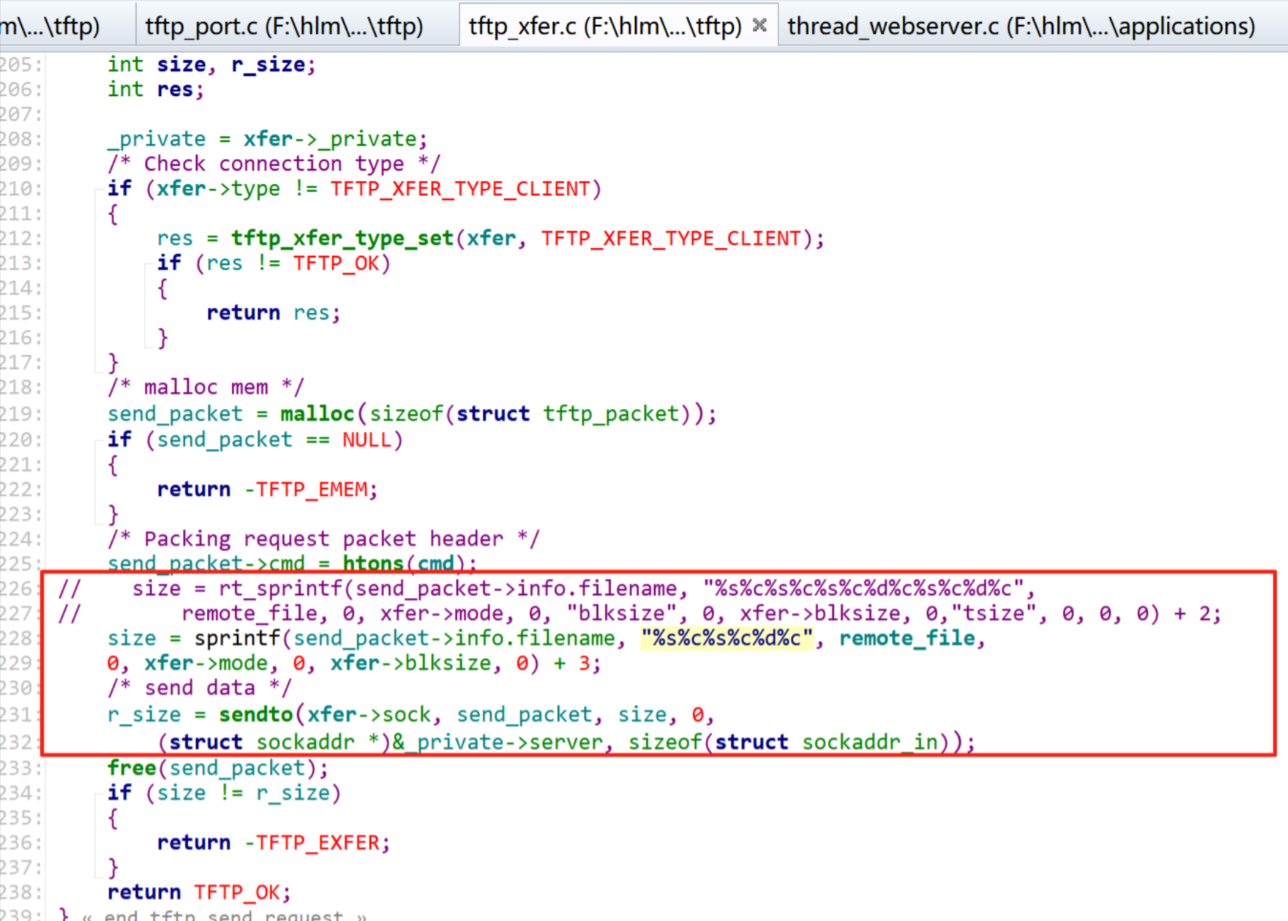 Modify the tftp_xfer.c file to the following code, and the test should be successful.