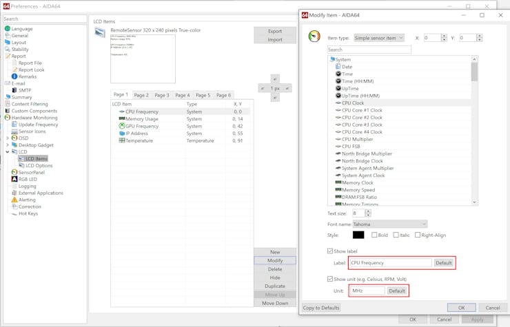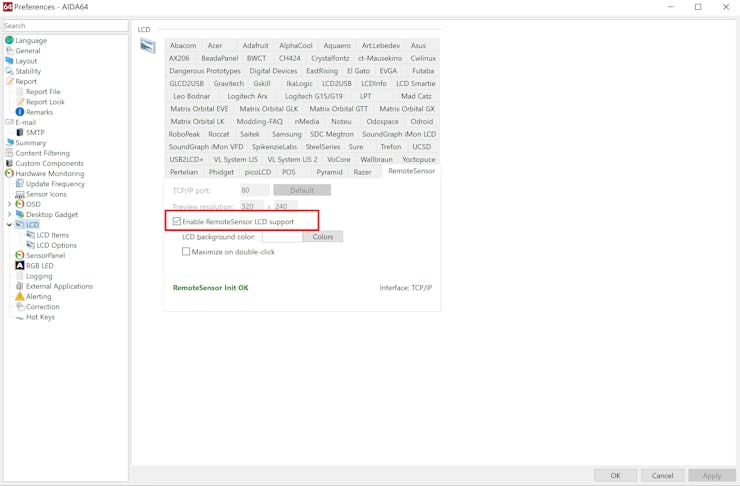 open Aida64 and goto "File">>"Preferences">>"LCD".then tick"Enable Remotesensor LCD SUPPORT".