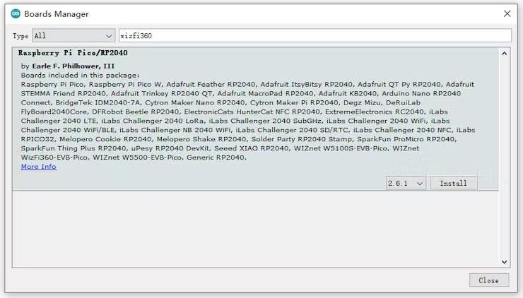 "Tools->Board:"***"-> Raspberry Pi RP2040 Boards(2.6.1) " Select “WIZnet WizFi360-EVB-PICO”.
