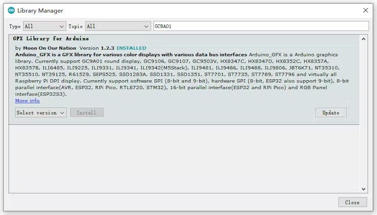 Add “GFX Library for rduino”, this library support the round screen GC9A01.