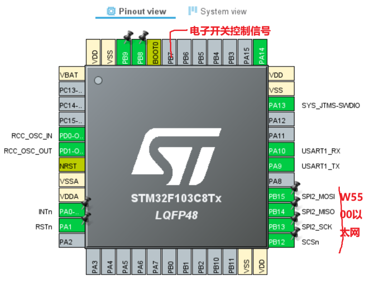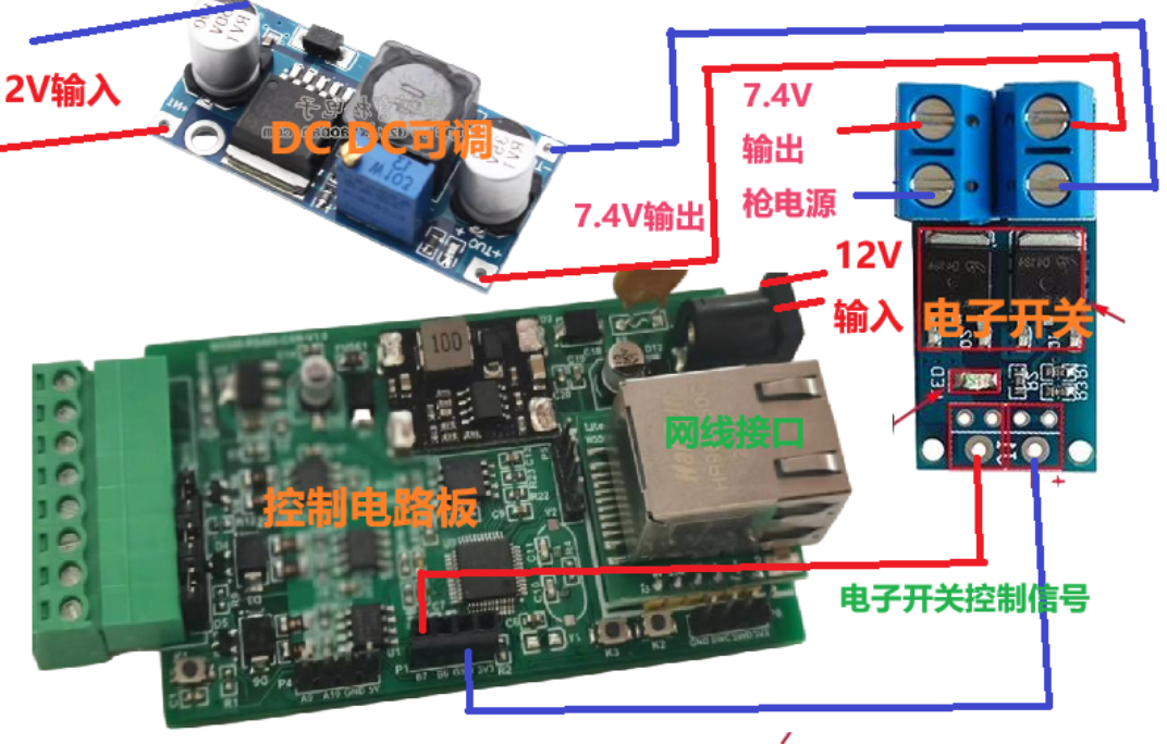 I bought a development board before, which had an STM32F103C8T6 chip, a W5500 Ethernet module, two CAN channels, and two 485 channels, for about 150 yuan. Actually, you don't need so many functions to control the gun. All you need is a board with a W5500 Ethernet module and GPIO output. The GPIO ports control the electronic switches to power the gun.