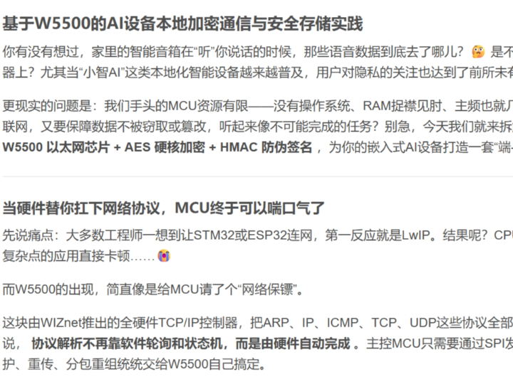 For maker use, the important point is that this is not just a networking example and not just a crypto example. It is a practical split between communication offload and local data protection on resource-constrained hardware. The article explicitly frames the target as MCU-class devices with limited RAM and clock speed, where a simpler Ethernet path helps leave more CPU time for AI or application logic.