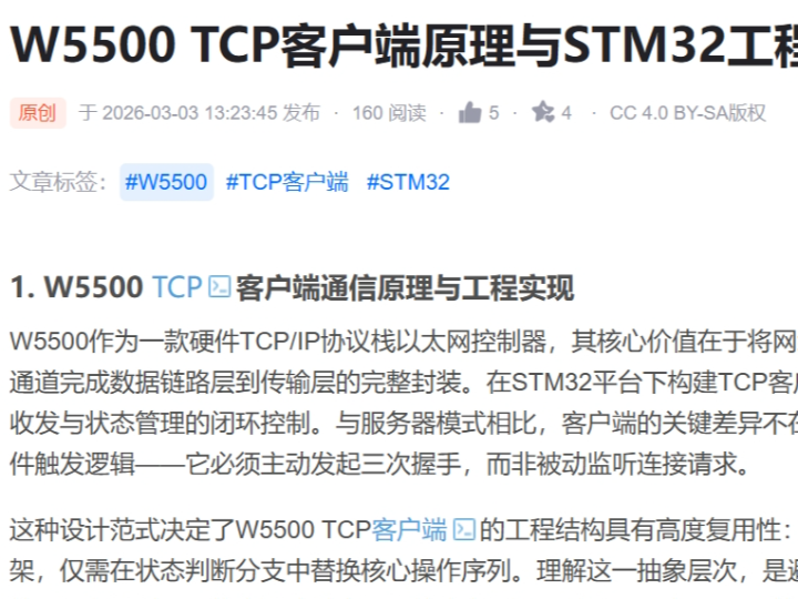 Original source: CSDN article, “W5500 TCP客户端原理与STM32工程实现,” published March 3, 2026. The page states CC BY-SA 4.0.