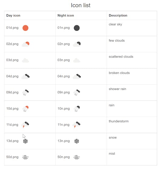 For code 500 - light rain icon = "10d". See below a full list of codes