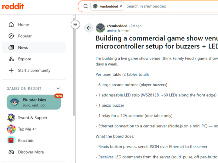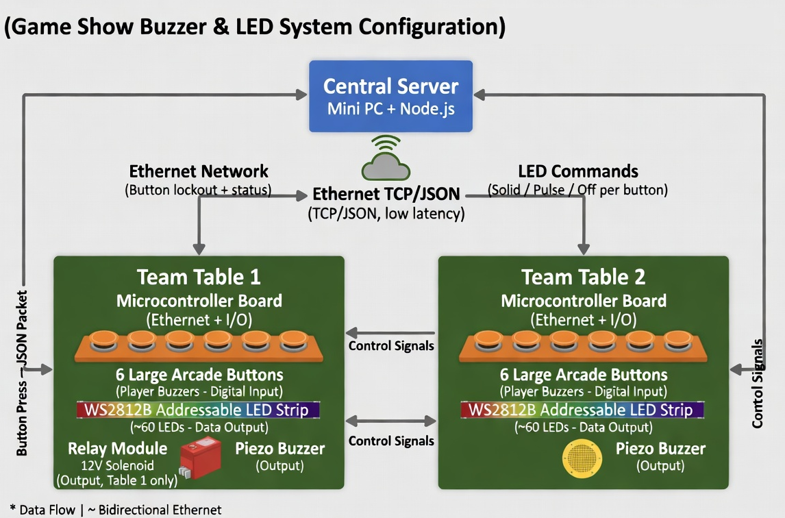 Building a commercial game show venue — need the most reliable microcontroller setup for buzzers + LEDs +Ethernet