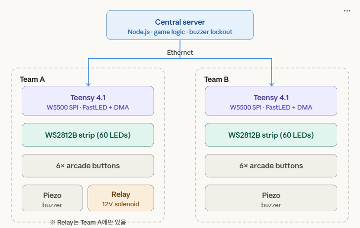 요약하자면, W5500은 "실시간 게임 데이터(버튼 누름, LED 명령)를 유선 네트워크로 안전하게 전달하기 위한 핵심 통신 부품"으로 사용되지만, 동시에 시스템의 다른 정밀 제어 작업과 자원 충돌을 일으킬 수 있는 변수로 언급되고 있습니다.