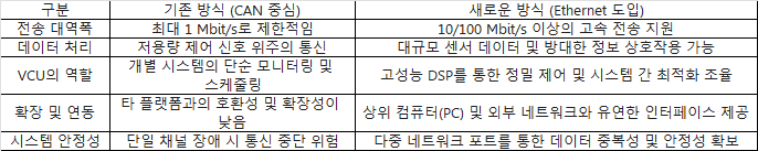 이더넷 통신 기술의 장점을 충분히 활용하여 기존 CAN 전송 방식의 단점을 보완하였으며, 이는 현재 VCU 지역 네트워크(Regional Networking) 발전 방향에 부합합니다.