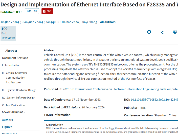 이 논문은 TMS320F28335 DSP와 W5500 이더넷 칩을 결합하여 차량 제어 장치(VCU)를 위한 효율적인 이더넷 인터페이스를 설계하고 구현한 내용을 담고 있습니다.