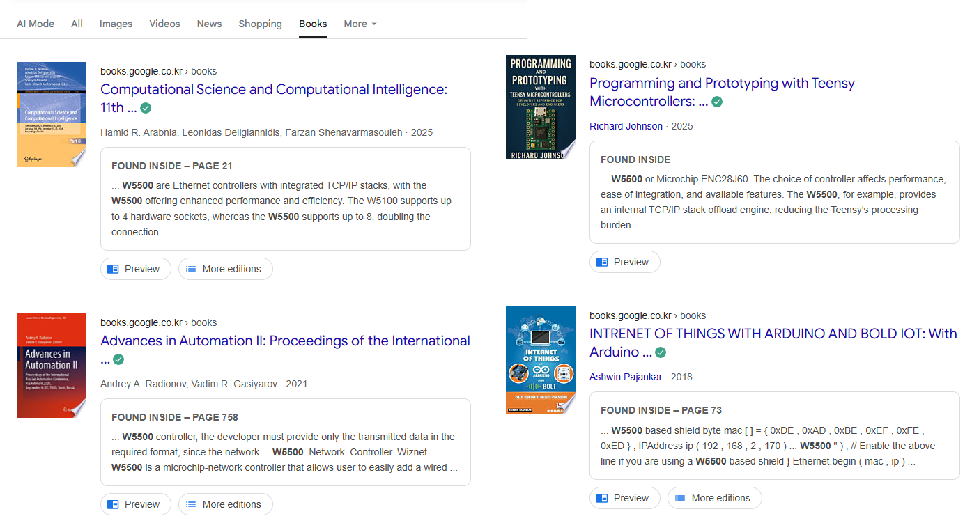 books.google.com 에서 w5500 으로 검색하니 여러 개의 책이 나왔다.