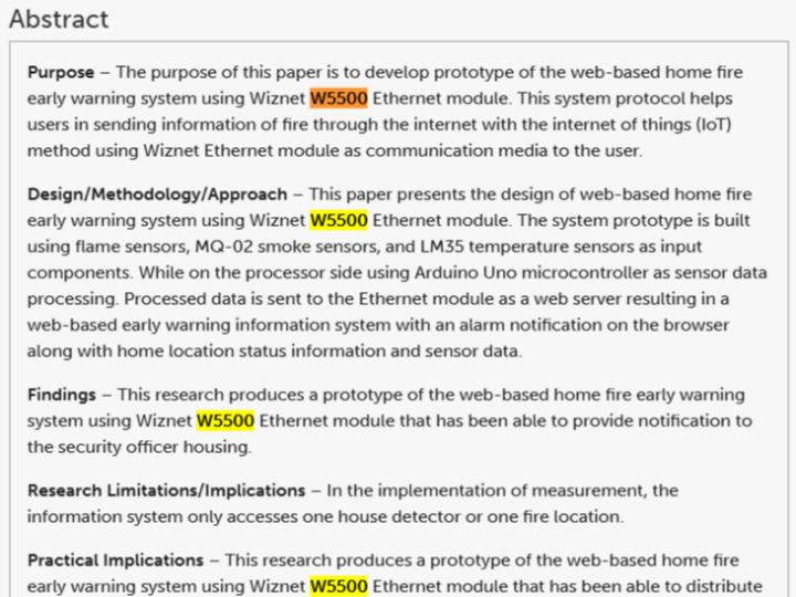 연구 결과, Wiznet W5500 이더넷 모듈을 사용한 웹 기반 화재 조기 경고 시스템 시제품이 성공적으로 구축되었습니다.