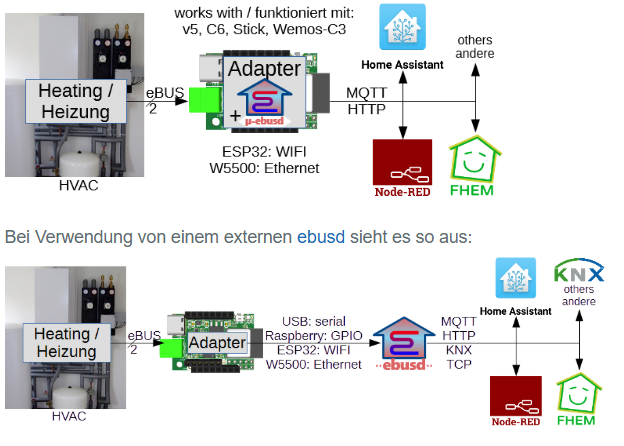 easi> and micro-ebusd: Dedicated firmware and protocols are used to drive and communicate with the adapter.