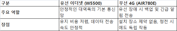 통신 이중화: 유선 이더넷(RJ45)과 무선 4G(LTE Cat-1)를 동시에 지원하여 유선망이 끊겨도 서버와 통신을 유지합니다.