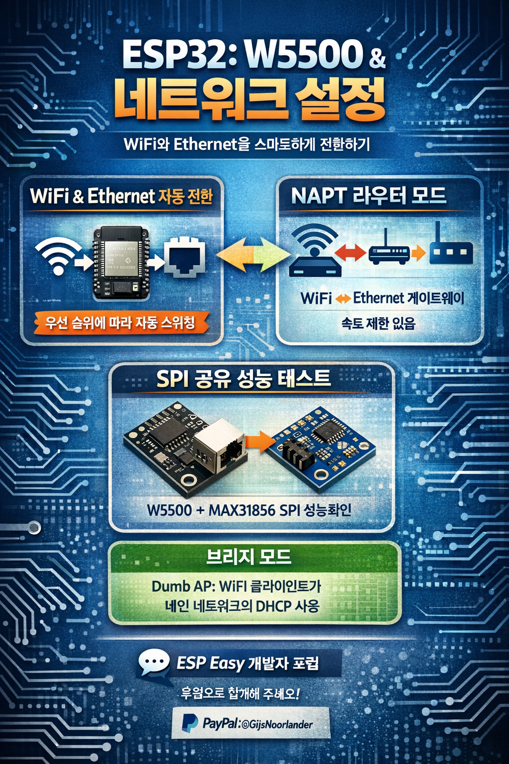 이 대화는 ESPEasy 포럼에서 WIZnet W5500 이더넷 컨트롤러와 네트워크 기능에 대한 기술 지원 논의입니다.