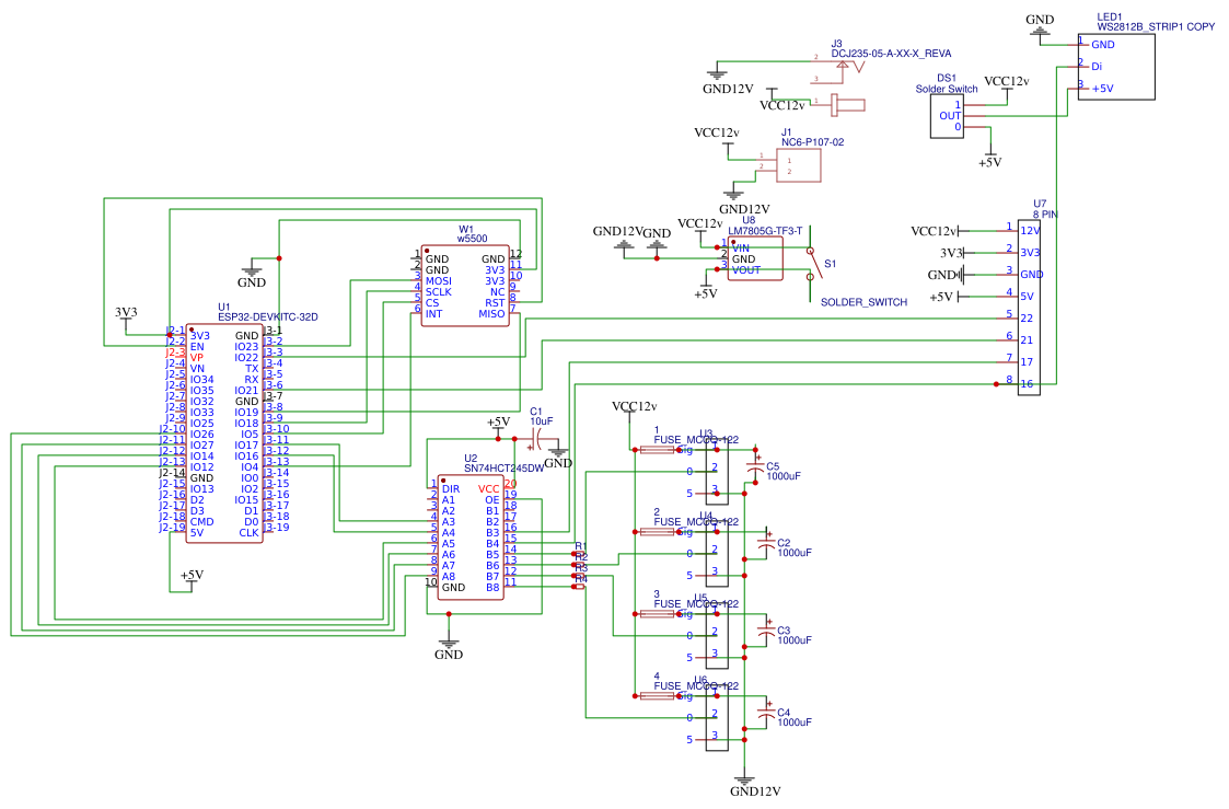 오른쪽: 12V → 5V 전원부(U8) + 12V 분배 회로(퓨즈 4개, 큰 전해콘덴서 4개) + LED 스트립 커넥터(U7, LED1: WS2812B 스트립)