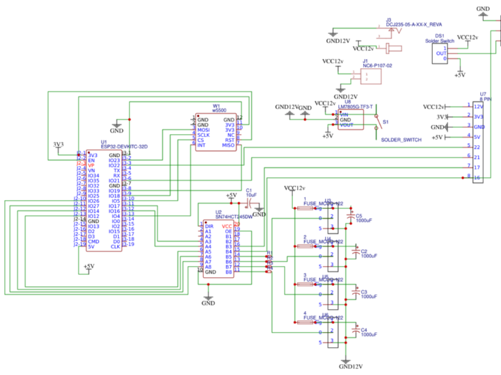 ESP32 + W5500 + 12V/5V 전원 + LED/부하 제어가 통합된 회로도(모듈 디자인)를 공개한 페이지