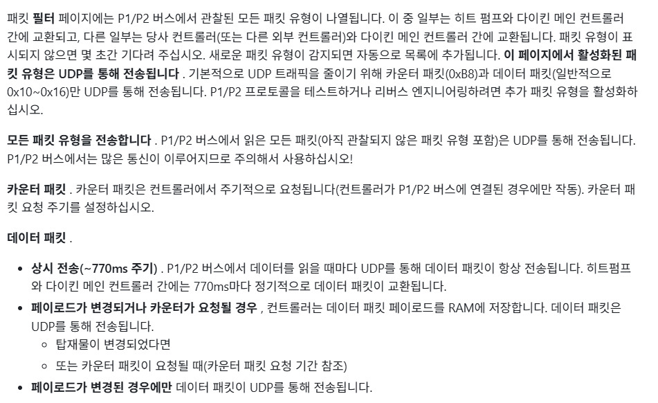 시스템은 Daikin 내부 통신에 사용되는 P1/P2 시리얼 버스 프레임을 직접 읽고 쓰며,