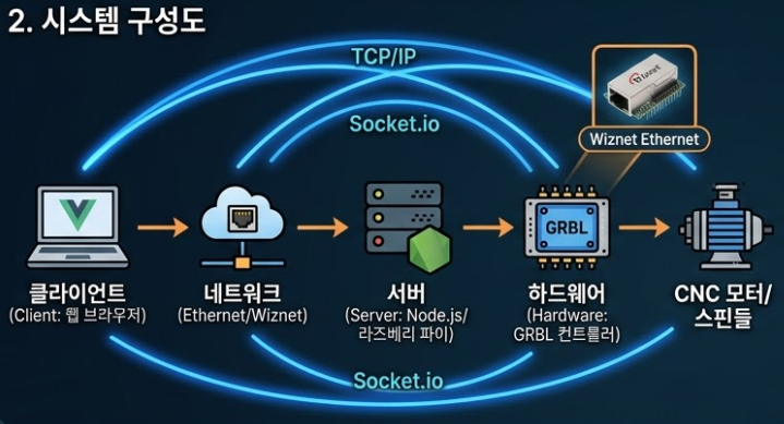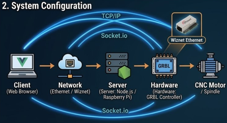 - 서버(Server): Node.js 기반의 중계 서버. CNC 장비와 연결된 PC나 라즈베리 파이에서 실행됩니다.