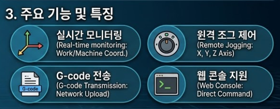 - 원격 조그 제어(Jogging): X, Y, Z축 이동을 웹 UI에서 버튼 클릭으로 제어합니다.