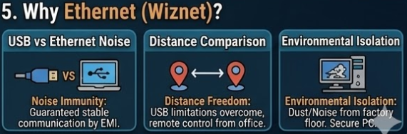 The strong electromagnetic interference (EMI) generated during CNC machining is a major cause of connection drops in standard USB communication. Utilizing Wiznet's Ethernet technology provides the following advantages: