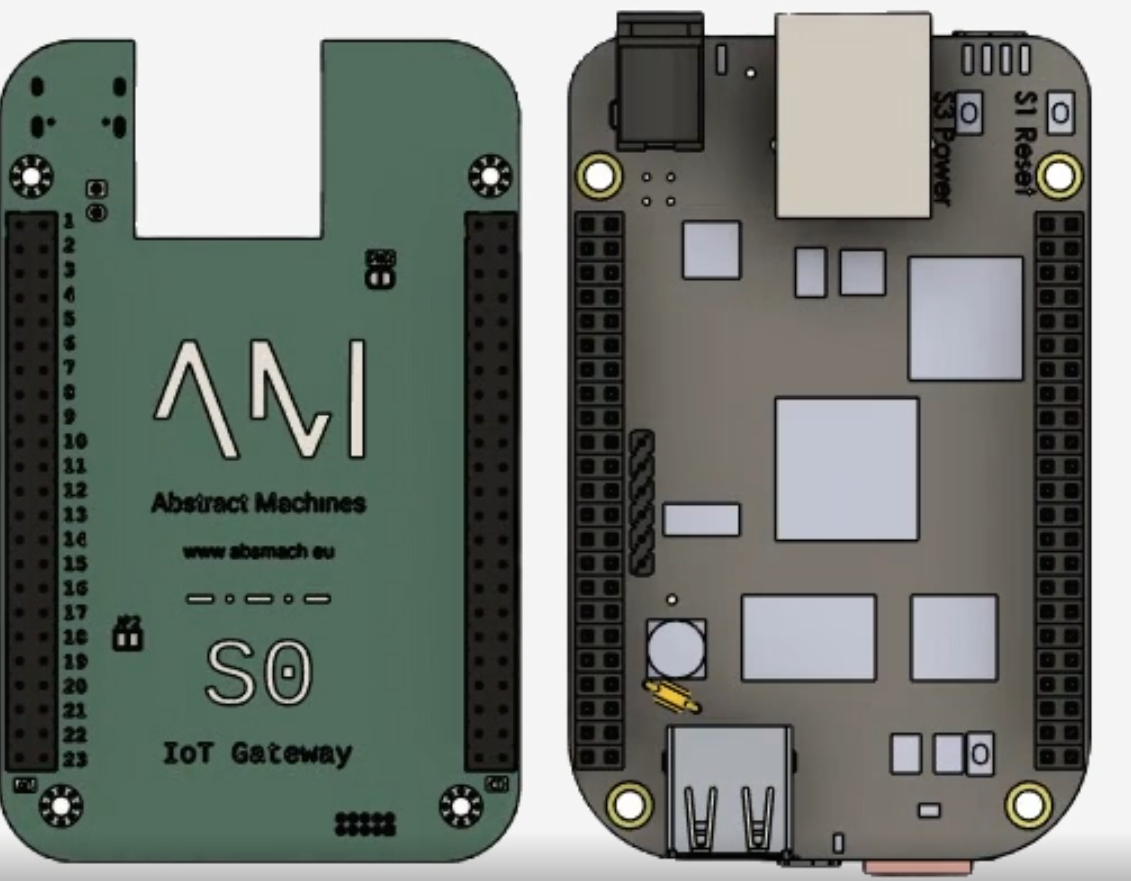 Abstract Machines S0는 프랑스의 Abstract Machines에서 설계한 초소형 네트워크 기반 제어 보드로, 임베디드 시스템과 외부 네트워크를 간단하고 안정적으로 연결하는 것을 목표하며,, 단순함·신뢰성·확장성에 초점을 맞춰 설계되었습니다. RISC-V 기반의 저전력 IoT 게이트웨이와 Linux 기반 RISC-V IoT 게이트웨이를 함께 제공합니다.