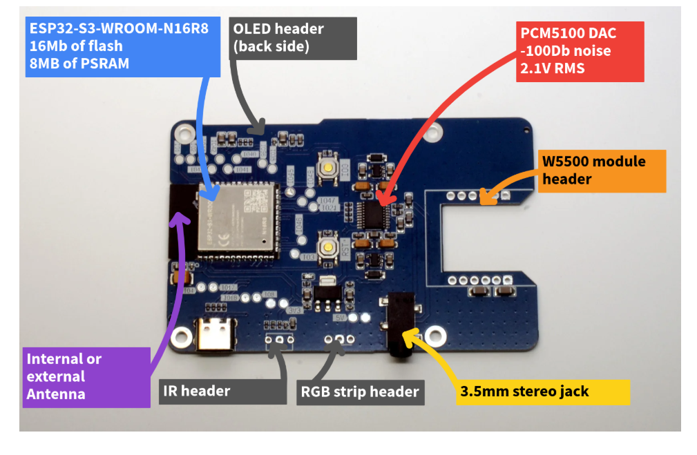 | Software | ESPHome / Squeezelite-ESP32 / Arduino | Supports both Wi-Fi and Ethernet streaming |