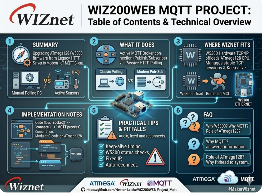 This project is a transformative effort to repurpose WIZnet's classic WIZ200WEB board into a modern MQTT-based Industrial IoT (IIoT) client. Built around the 8-bit ATmega128 microcontroller, it utilizes the hardware TCP/IP stack of the WIZnet W5300 to ensure stable, high-performance data exchange with a cloud broker. The core objective is to move away from a simple, passive web server architecture to a modern, active IoT node.