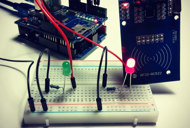 when RFID reader read a tag, UNO check unique UID and compare with uniqur UID in code. If it's same runs a PHP script via http request that updates the database with the date and time of card use and its ID. If the authorization was successful, the green LED lights up. Otherwise, the red LED lights up.