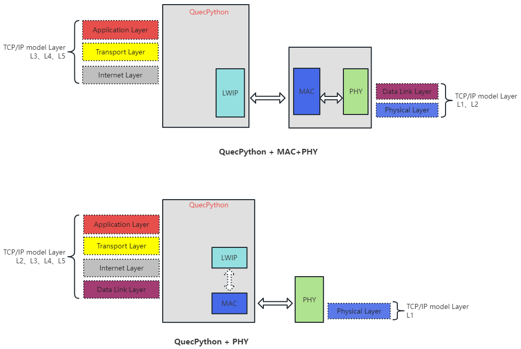 Although EC600N/EC600U are originally wireless modules, they can support Ethernet by connecting a W5500 configured as a MAC + PHY device working with the internal lwIP stack.