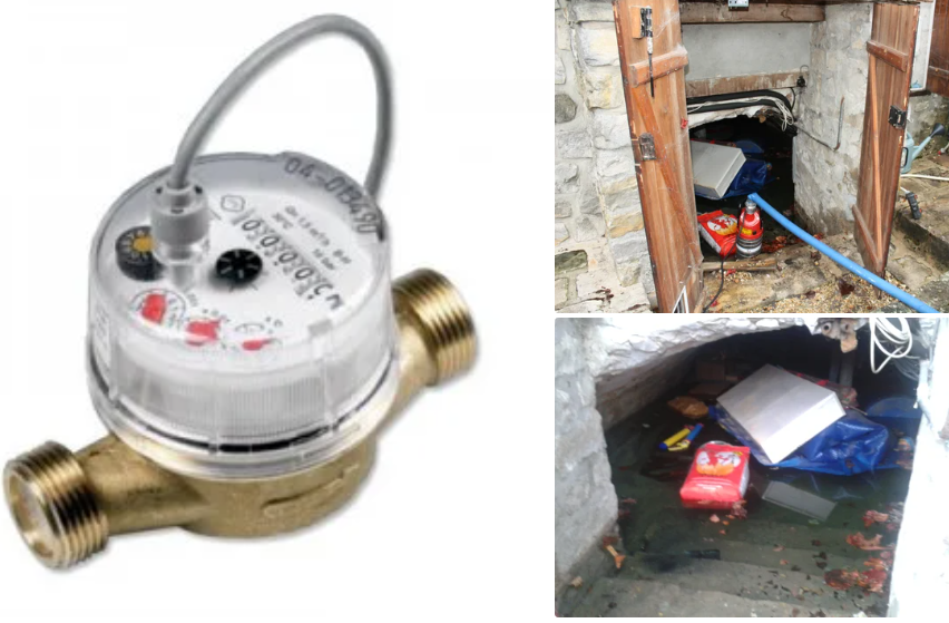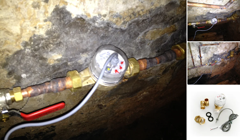 이 첫 번째 사진은 일반적인 물 수도계량기로, 센서 케이블을 연결하여 펄스 신호를 읽을 수 있도록 개조한 모습을 보여줍니다. 사진은 저자가 당했던 물난리 현장을 나타내며, 불시에 발생한 누수를 계기로 물 사용량을 지속적으로 감시하려는 필요성이 생겼습니다.