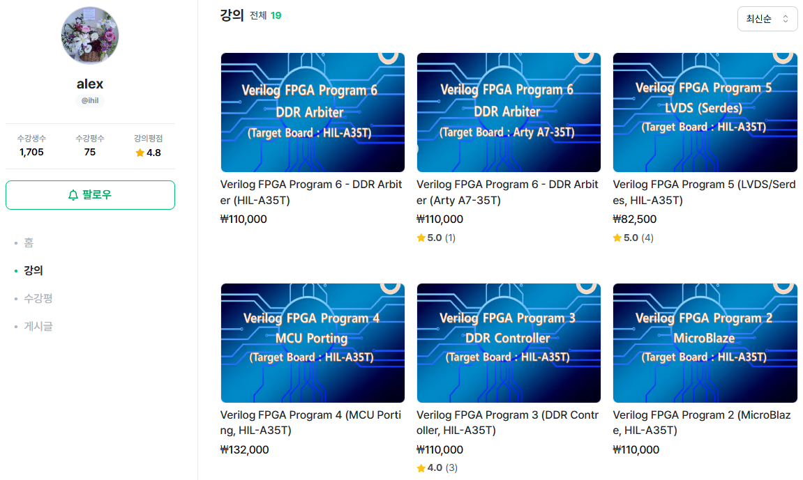 강의는 총 19가지가 있고 수강생수가 1,705명, 수강평수가 75개, 강의 평점이 4.8점 정도로 꽤나 질 높은 강의를 업로드하고 계십니다.