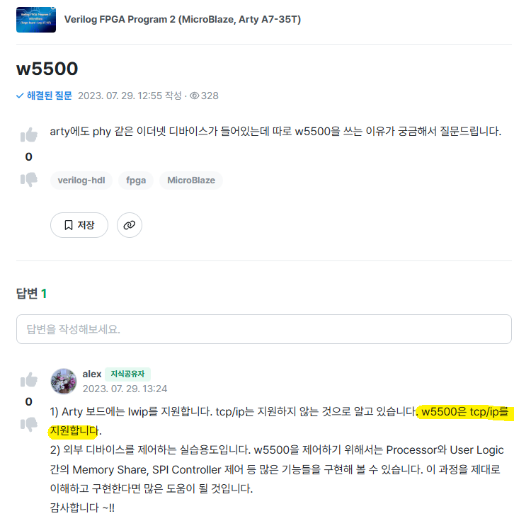 FPGA에서는 W5300이 많이 사용되었던 기억이 있는데 MicroBlaze처럼 SW 코어를 포팅해버리면 W5500을 쉽게 사용할 수 있는 환경이 만들어 질 수 있어 유저들이 사용하기도 하는구나 라는 것을 알게됐습니다.