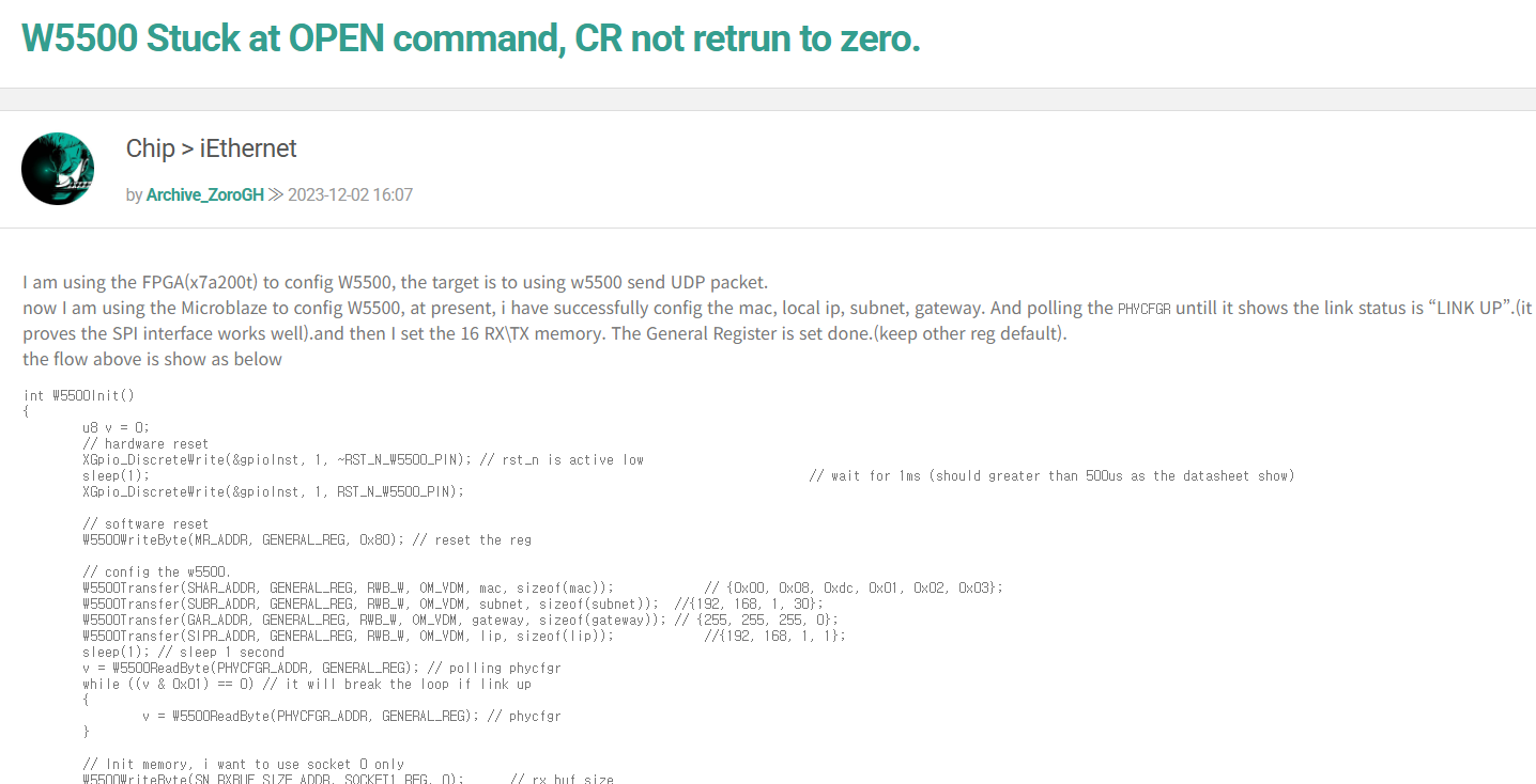 While researching MicroBlaze, I also found a relevant question on the WIZnet Maker website discussing socket control when using MicroBlaze.