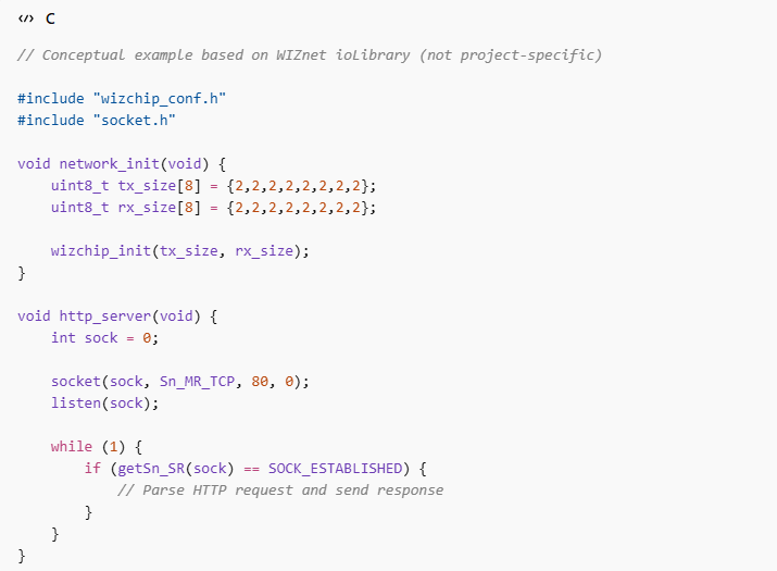 The project uses WIZnet’s ioLibrary-based approach to implement a simple HTTP web server.
