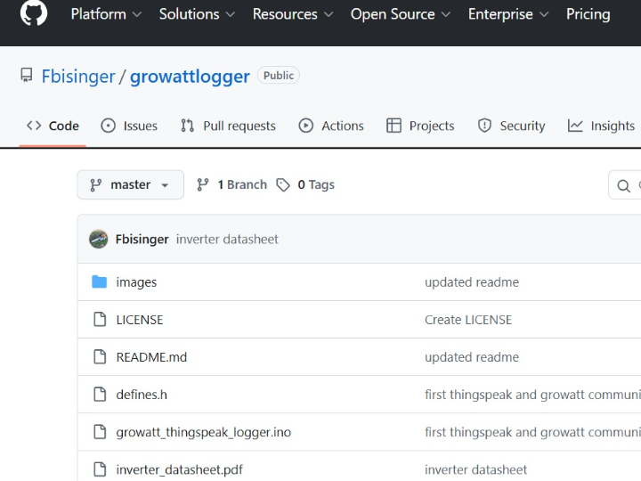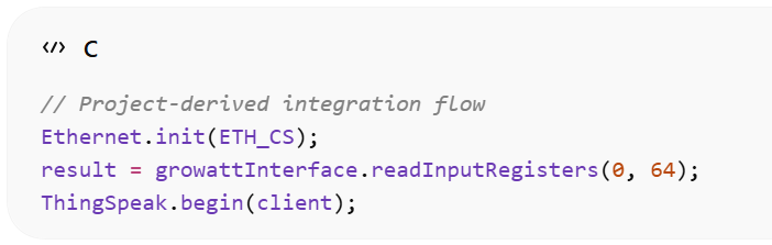 The firmware architecture is straightforward: read inverter registers over RS485 Modbus, scale raw register values into engineering units, then write selected fields to a ThingSpeak channel over the W5500 Ethernet connection. The published sketch uploads output power, PV1 voltage, daily energy, grid voltage, and grid frequency, while also setting a status string depending on inverter state.