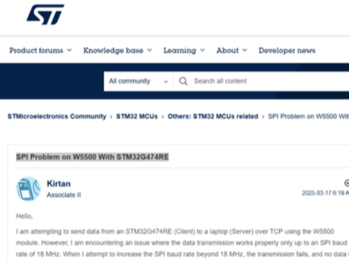 A community user reported trouble interfacing W5500 SPI with an STM32G474RE MCU on a Nucleo board. The intention was to communicate over SPI from the STM32 to the W5500 to run Ethernet services (e.g., TCP/IP). However, the interface failed above a certain communication speed.