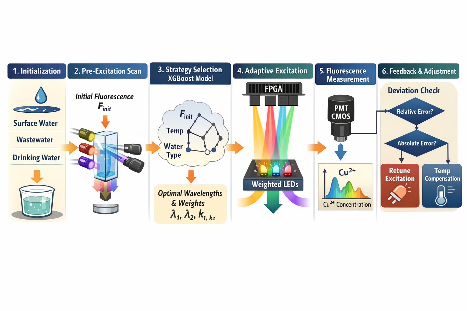 Fifth, the fluorescence signal is measured using the sensing module, and the result is converted into Cu2+ concentration. At this stage, the adaptive excitation strategy is expected to improve signal quality by reducing mismatch between the sample’s background characteristics and the detector’s operating condition.