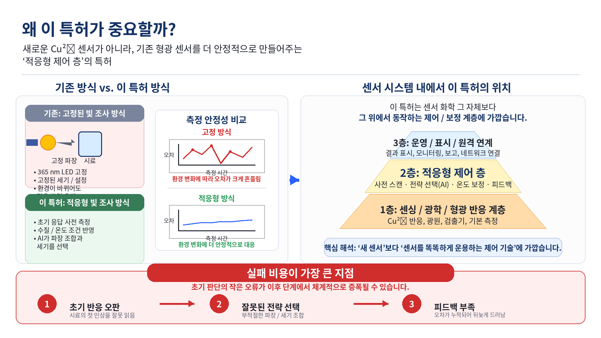 이 특허는 얼핏 보면 “구리 이온을 형광으로 측정하는 기술”처럼 보이지만, 실제 핵심은 거기에만 있지 않습니다. 진짜 포인트는 형광 검출 조건을 시료 상태에 맞게 바꾸는 적응형 제어 구조입니다.