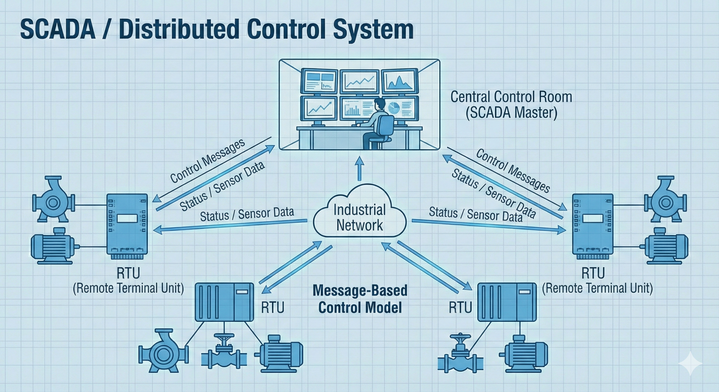 메시지 기반 제어 모델이 산업용 SCADA/RTU 구조와 논리적으로 동일하다.